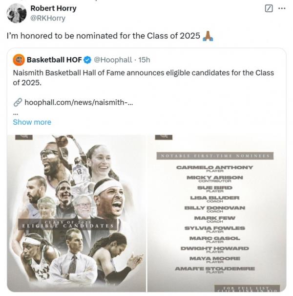 其中,七冠成員羅伯特-霍里在列。對此,他轉(zhuǎn)推評論道:“我很榮幸能夠提名2025屆奈史密斯名人堂。”